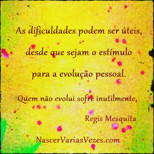 As dificuldades podem ser úteis desde que sejam o estímulo para a evolução pessoal. Quem não evolui sofre inutilmente. Regis Mesquita Paz interior
